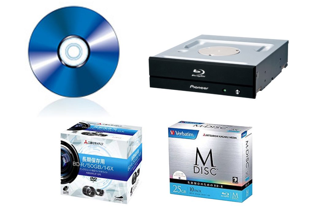 | 特徴 | M-DISCとは、耐久性を高めたDVDやブルーレイディスクのことです。 光や熱、湿度などの影響による経年劣化に強い。開発元では1000年にわたってデータが保存できるとのこと。 M-DISC DVDとM-DISC Blu-rayが用意されており、既存のDVDドライブやブルーレイドライブで読むことができるが、 書き込みには専用のドライブが必要 |